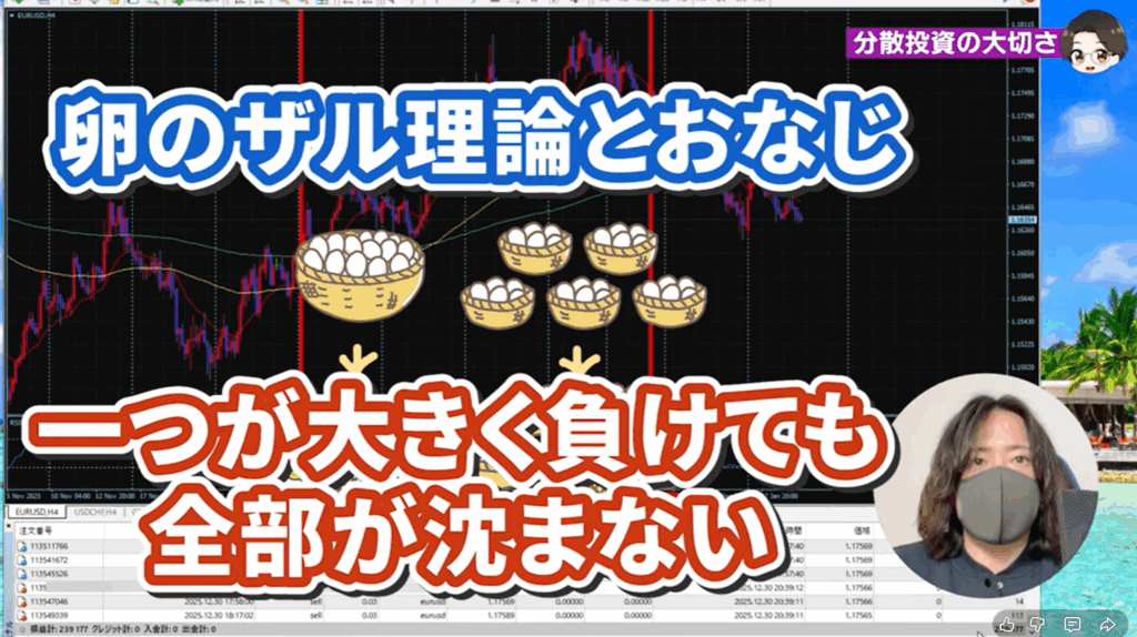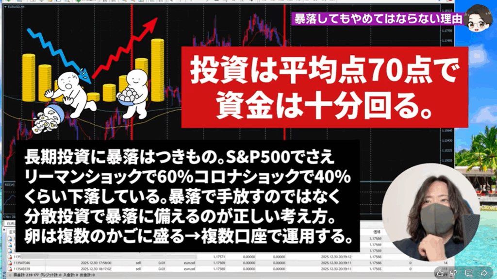 また、このYouTubeで公開している検証用の口座だけでなく4つ口座があってそれぞれ運用方法を変えているので1つがマイナスになってもすべてが沈むことはないという状態を作っています。これが長期投資では非常に重要です!