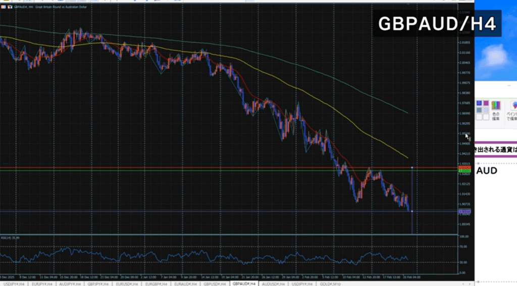 陰線、高値つけて切り下がっている感じです。きれいなエンゴルフィンがありましたが、ちょっと安値すぎちゃう部分もあるので半分くらい戻したところとかで入るのが個人的にはいいかなと思ったりします。